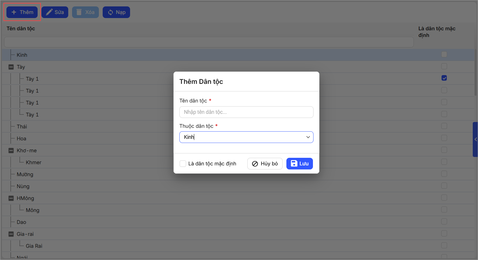 3. Trong trường hợp danh mục dân tộc phần mềm mặc định không có loại dân tộc của đơn vị, có thể nhấn Thêm để thêm loại dân tộc.