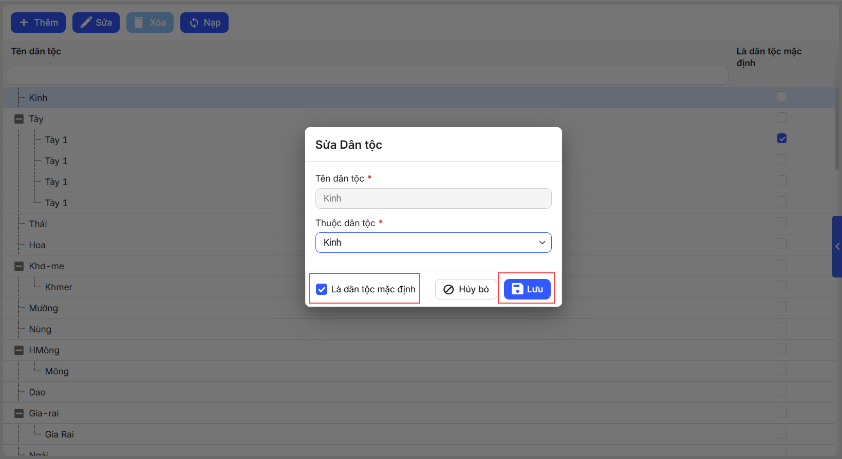 4. Nhập tên dân tộc. Chọn thuộc dân dộc nào. Tích chọn Là dân tộc mặc định. Nhấn Lưu.