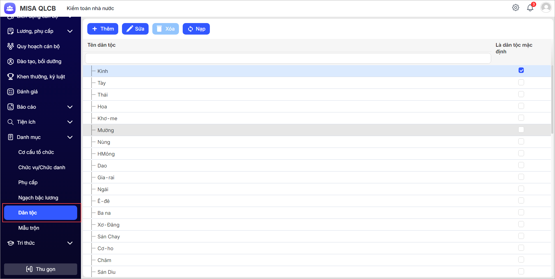 1. Tại menu Danh mục\Dân tộc, phần mầm đã tự mặc định dân tộc là dân tộc Kinh.