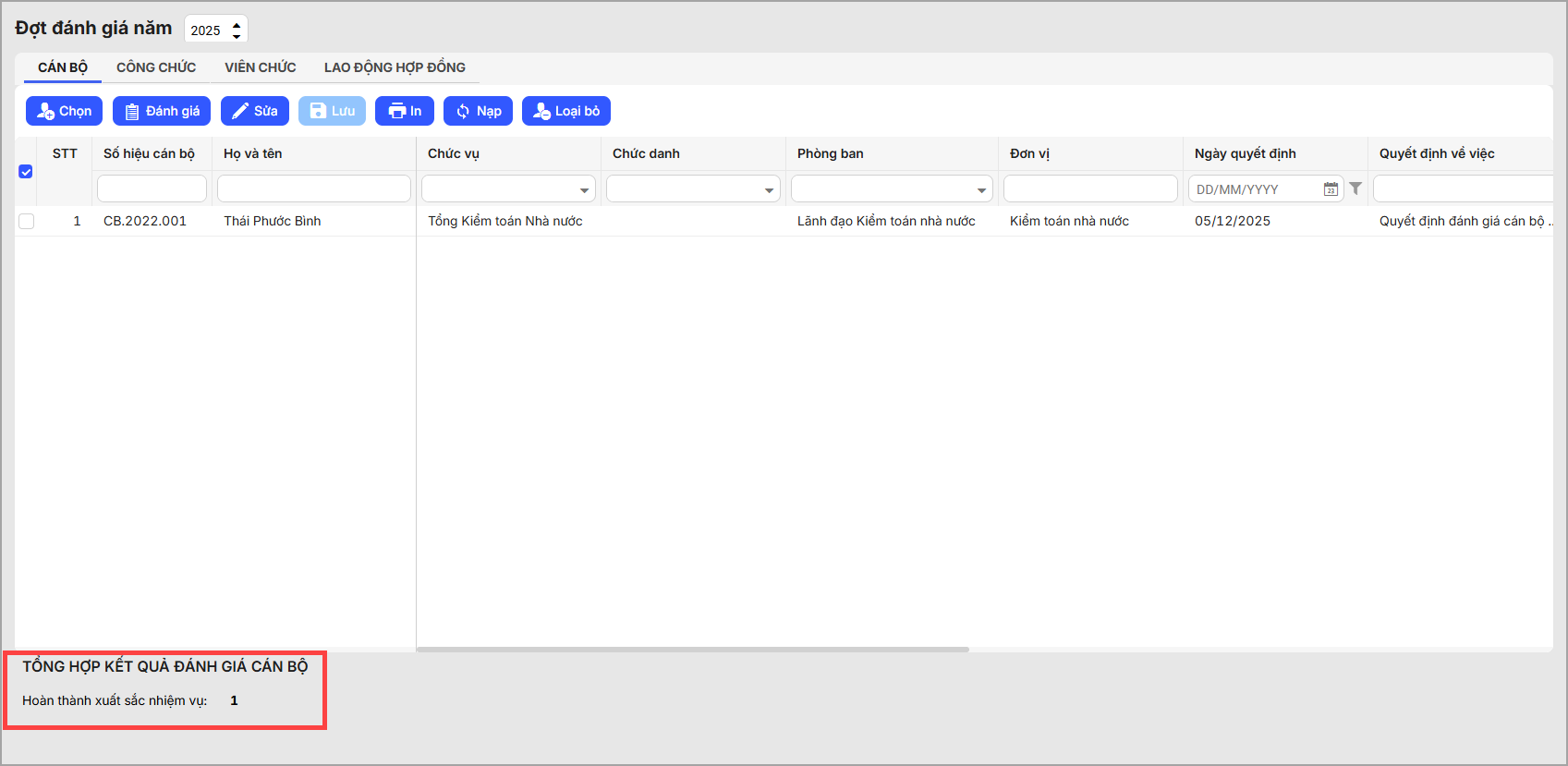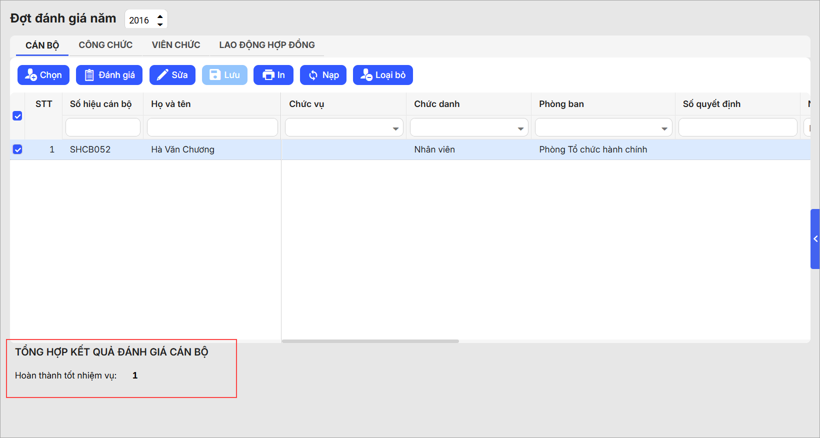 • Nạp: Load lại dữ liệu đánh giá hoặc danh sách cán bộ để cập nhật thông tin mới nhất.