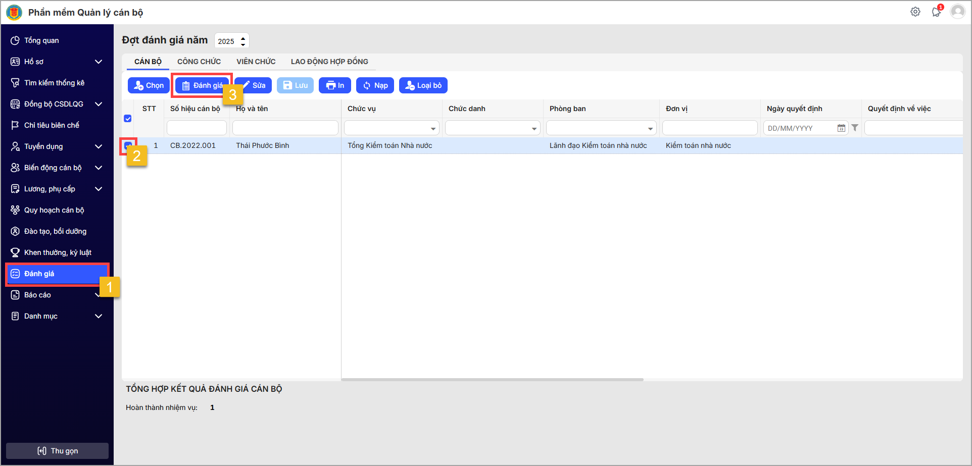 1. Anh/chị vào menu Đánh giá, tại tab Cán bộ, chọn một hoặc nhiều cán bộ, sau đó nhấn nút Đánh giá để thực hiện đánh giá.