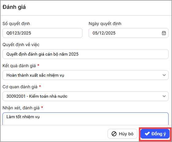 • Số quyết định: Nhập số văn bản quyết định chính thức liên quan đến kết quả đánh giá (ví dụ: QĐ123/2025).