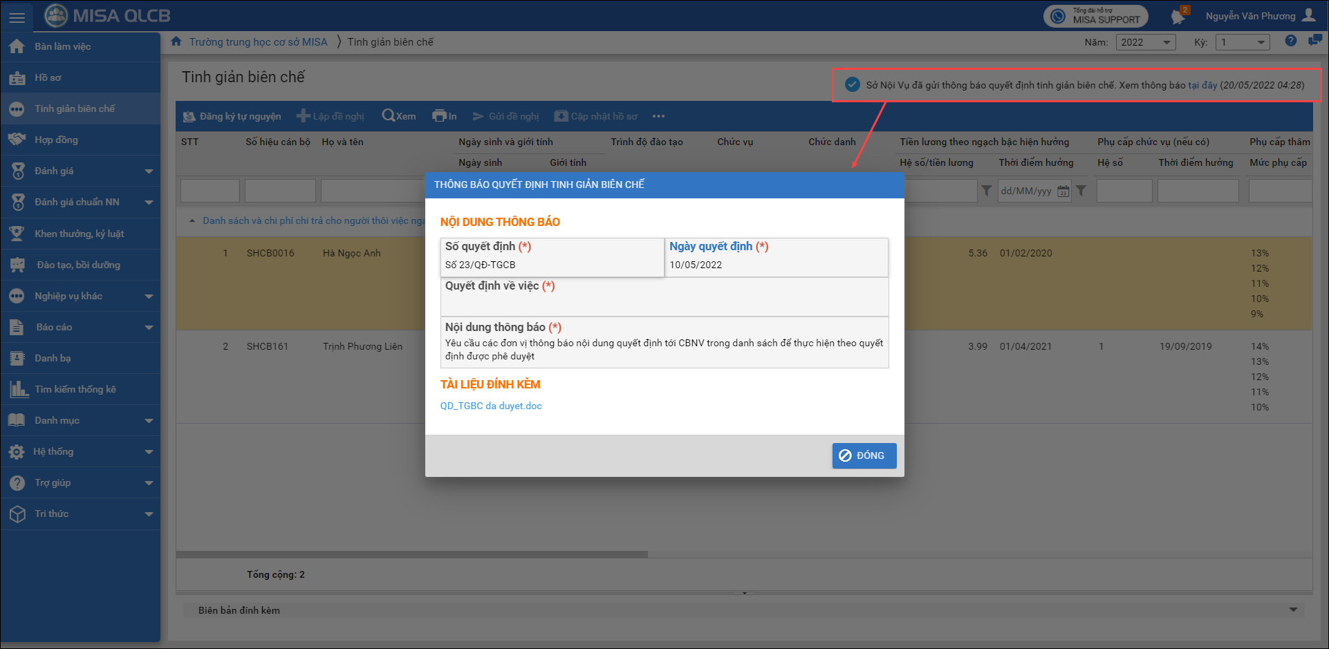 2. Chương trình sẽ hiển thị trạng thái “Sở nội vụ đã gửi thông báo tinh giản biên chế”. Khi anh/chị click vào trạng thái này, hệ thống sẽ hiển thị nội dung chi tiết của thông báo tinh giản biên chế từ cấp trên kèm tài liệu đính kèm nếu có.