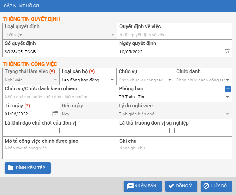 4. Phần mềm sẽ hiển thị form cập nhật hồ sơ tương ứng với chính sách tinh giản biên chế. VD ở đây là loại Thôi việc ngay.
