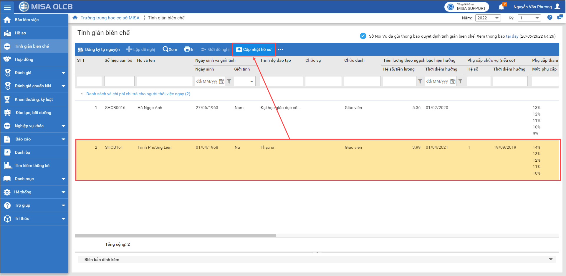 3. Tích chọn CBNV thuộc chính sách tinh giản biên chế, nhấn Cập nhật hồ sơ.