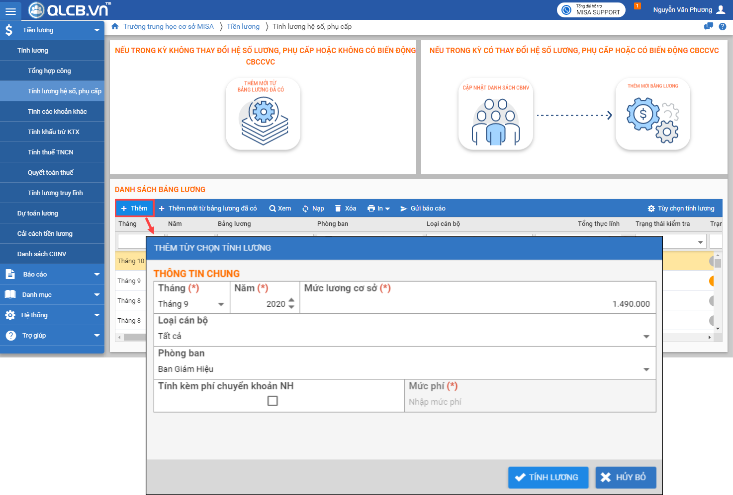 2. Nhập các thông tin Loại cán bộ, Phòng ban. nhấn Tính lương.