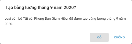 3. Trong trường hợp anh/chị thêm mới bảng lương đã có sẵn, phần mềm sẽ hiển thị thông báo trùng lặp. Nhấn Có nếu vẫn muốn tạo bảng lương theo tham số.