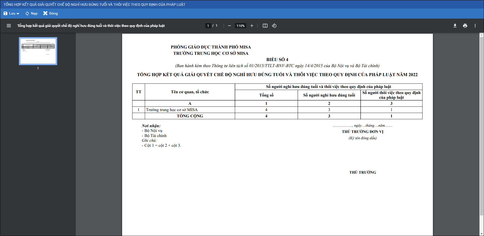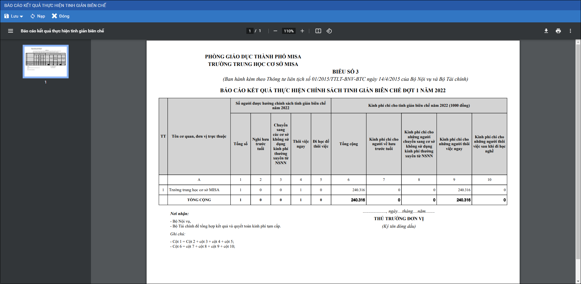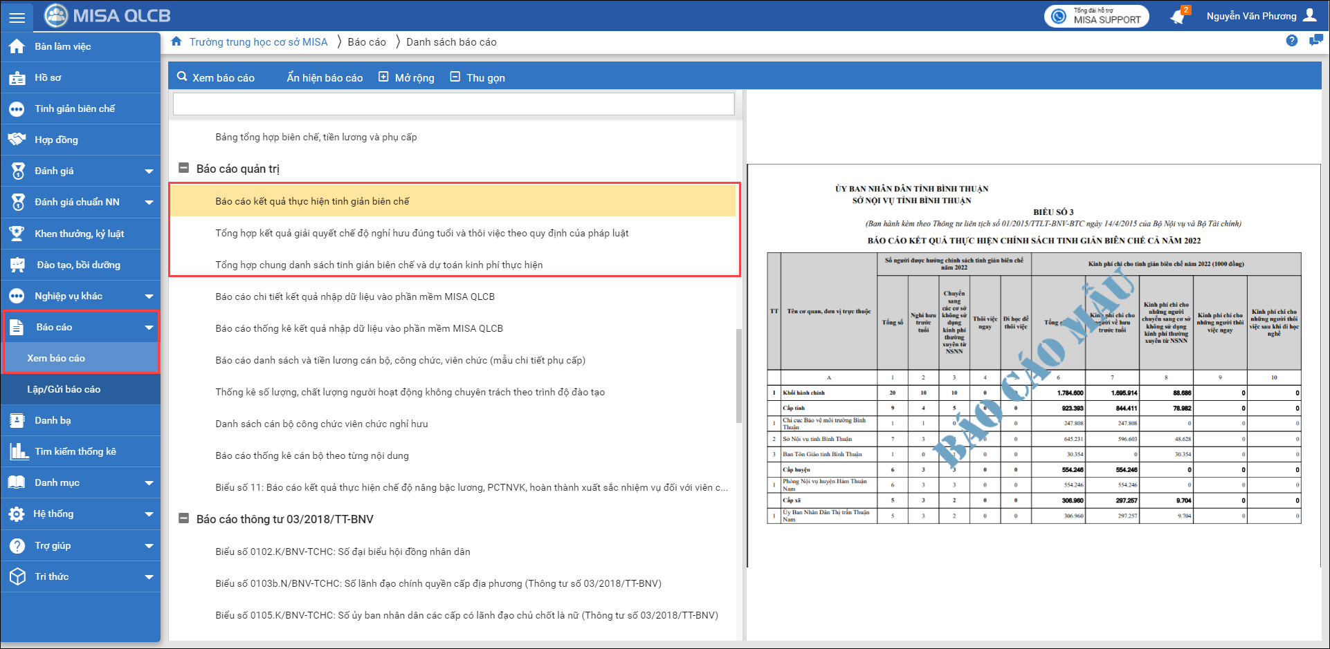 1. Cuối mỗi đợt (thường là tháng 6 hoặc tháng 12), đơn vị sẽ thực hiện in và nộp báo cáo thực hiện tinh giản biên chế lên cấp trên (mẫu 03, 04, 05) bằng cách vào menu Báo cáo\Xem báo cáo\Báo cáo quản trị. Tại đây phần mềm đã bổ sung các báo cáo:
