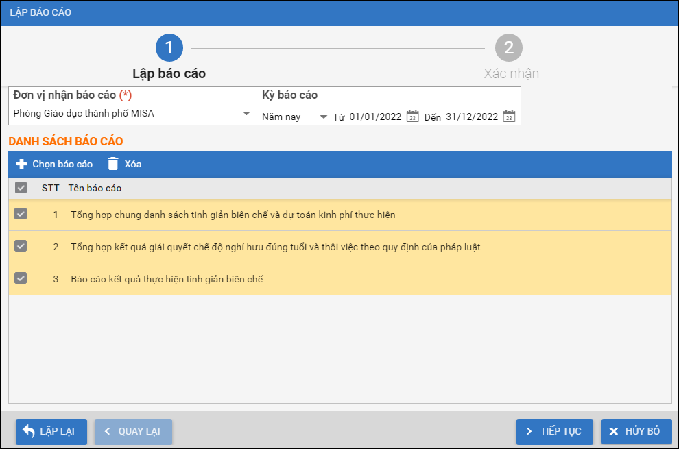 - Tích chọn các báo cáo và nhấn Tiếp tục.