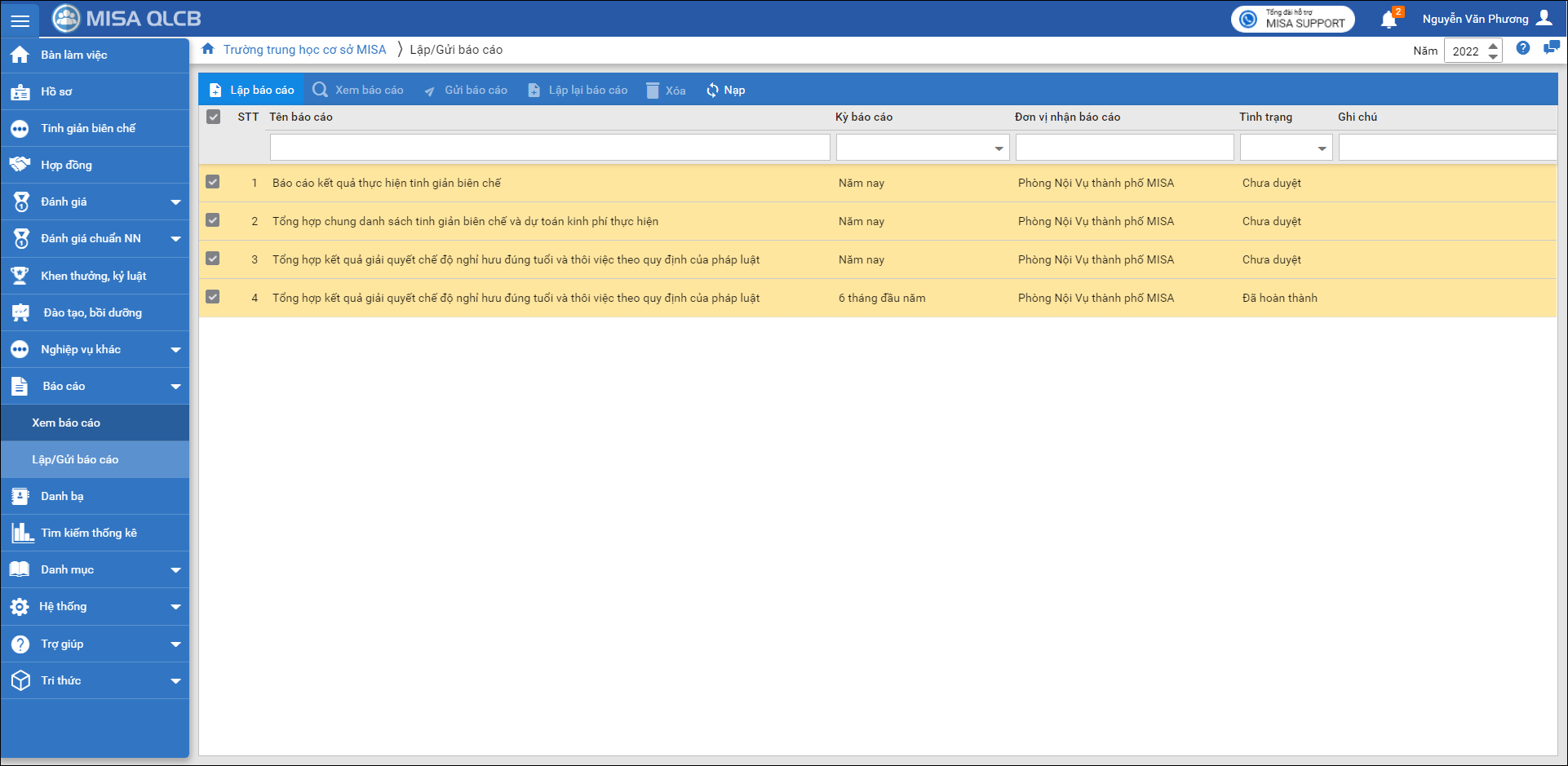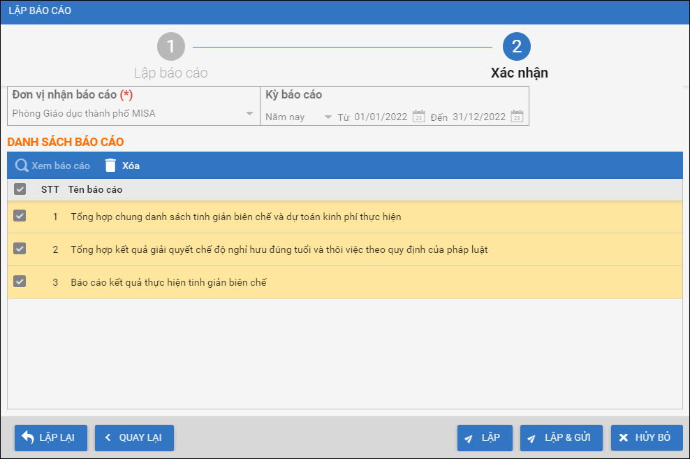 - Nhấn Lập và gửi, chương trình sẽ tự động gửi báo cáo đến đơn vị cấp trên.