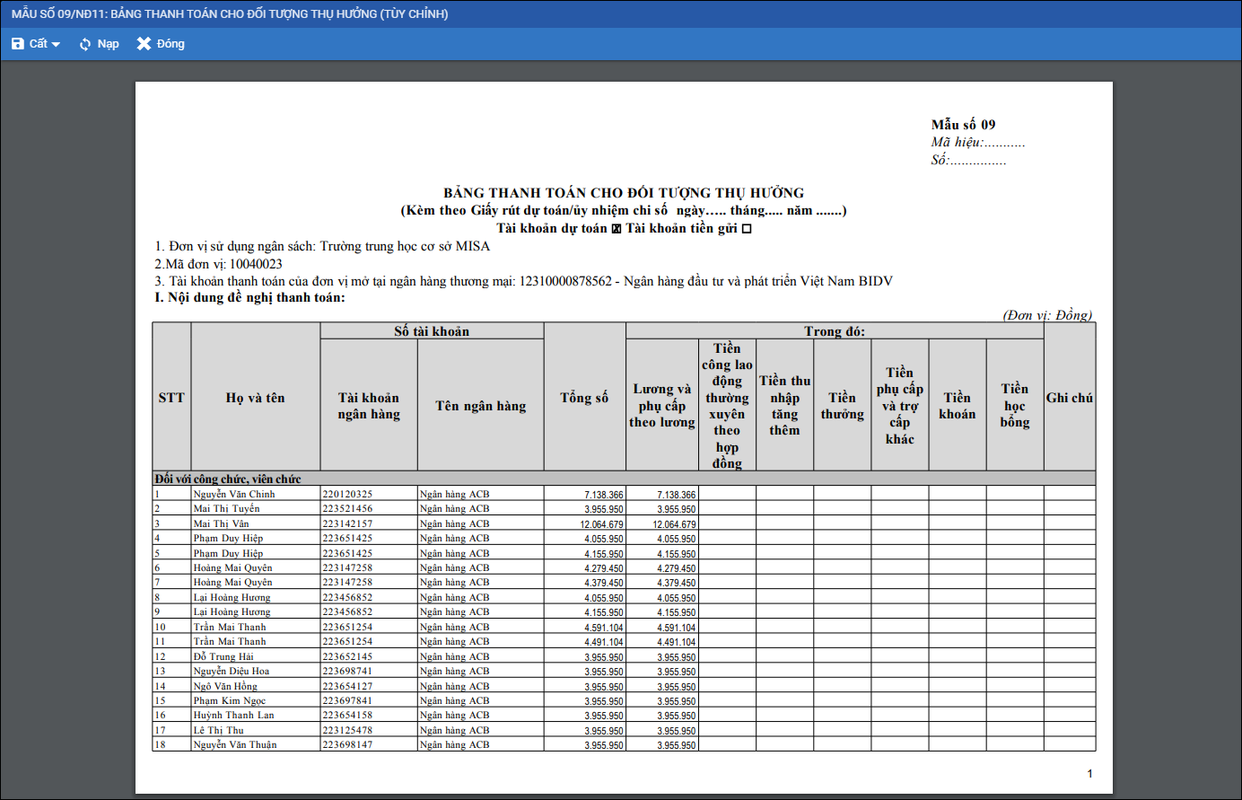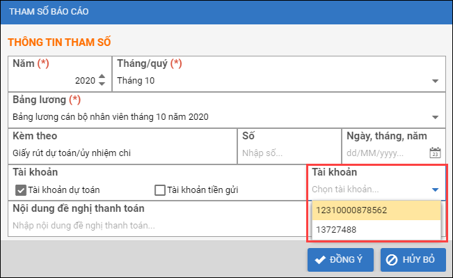 3. Nếu đơn vị có từ 2 tài khoản trở lên thì khi in bảng lương 09, anh/chị có thể lựa chọn tài khoản ngân hàng tiền sẽ được trả vào.