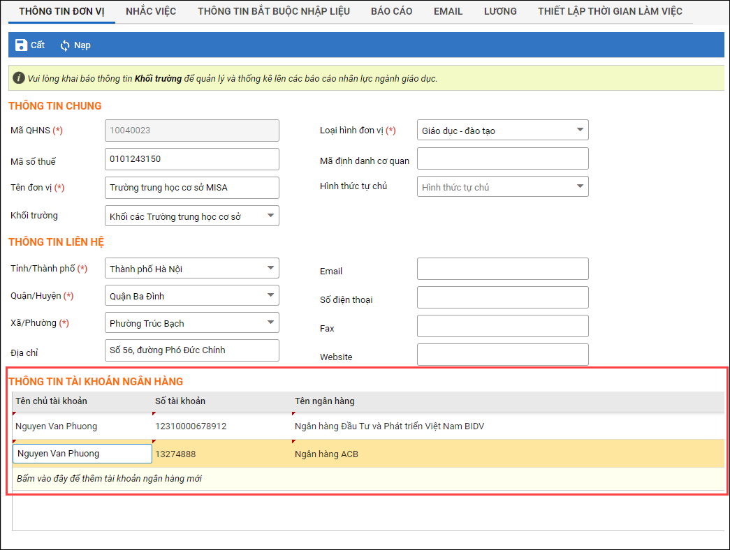 Giúp kế toán bổ sung thêm thông tin tài khoản ngân hàng khác của đơn vị để chi trả lương hàng tháng.