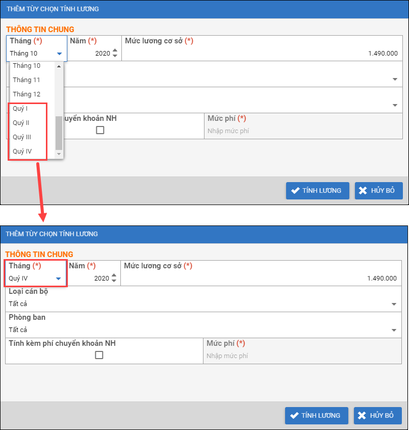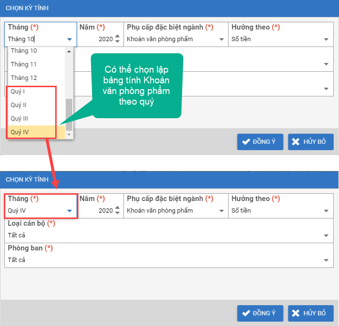 2. Tương tự, khi lập bảng Tính lương hệ số, phụ cấp, anh/chị cũng có thể lựa chọn kỳ tính lương là các quý trong năm.