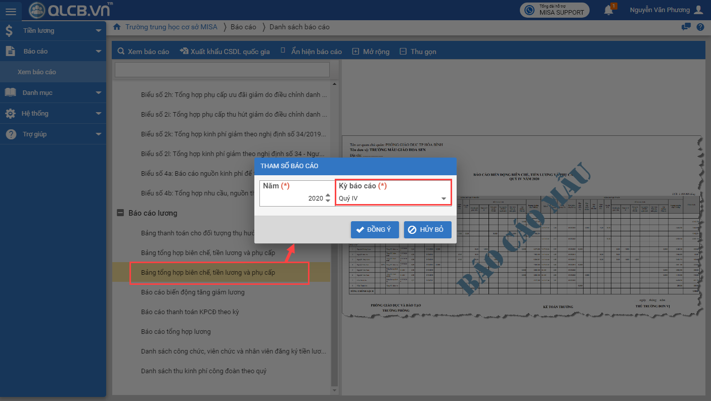 1. Tại menu Báo cáo\Xem báo cáo, chọn xem Báo cáo biến động số lượng biên chế theo quý.