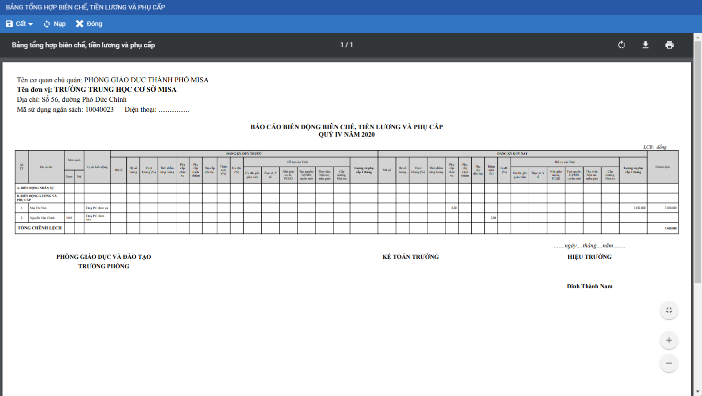 – Kể từ phiên bản R44, phần mềm bổ sung báo cáo tổng hợp thống kê số lượng biên chế hiện có, so sánh kỳ trước với kỳ này để đơn vị chủ quản/tài chính có thể nắm bắt được biên chế biến động tăng giảm và quỹ lương, phụ cấp tăng giảm tương ứng.