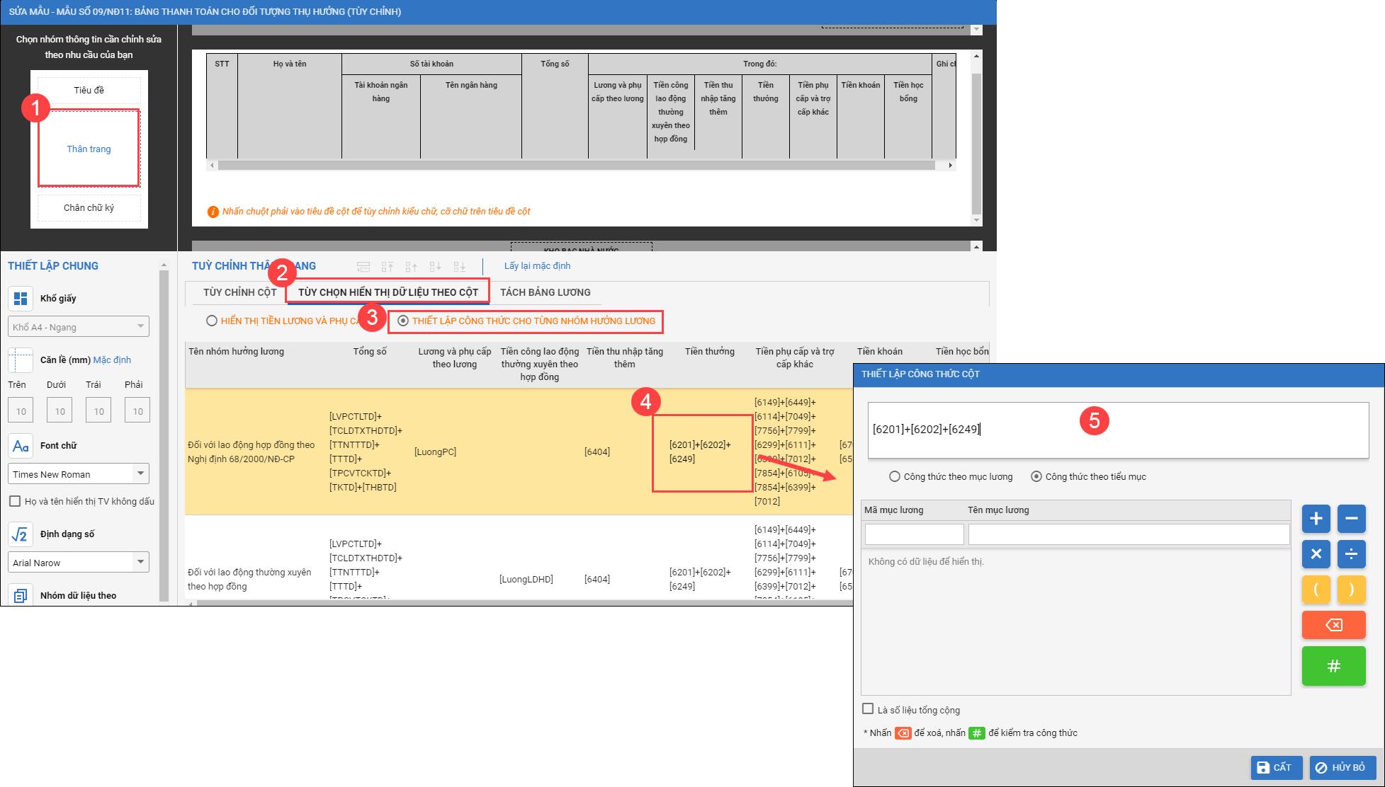 GIúp kế toán tùy chỉnh công thức hiển thị các cột cho từng nhóm đối tượng cán bộ trên bảng lương 09 NĐ11.