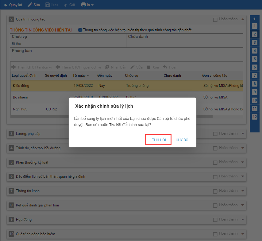 Sau khi gửi lý lịch bổ sung cho CBTC, nếu có thông tin cần chỉnh sửa, CBNV sẽ thực hiện nhấn Sửa, đồng thời thu hồi lý lịch đã gửi.