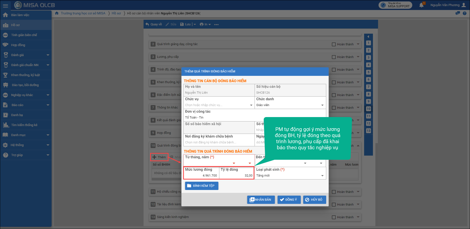 – Kể từ phiên bản R53, khi thêm mới quá trình đóng BH, phần mềm tự gợi ý ra thông tin Mức lương đóng BH, tỷ lệ đóng theo quá trình lương, phụ cấp đã được khai báo.