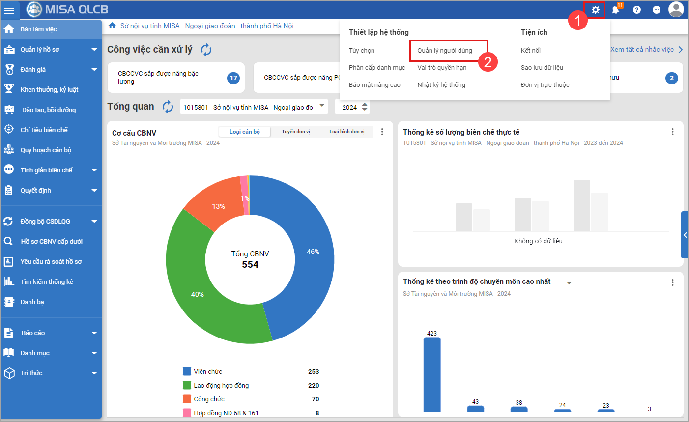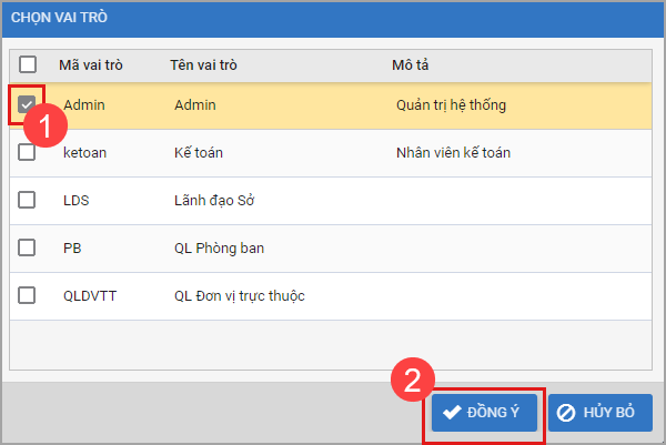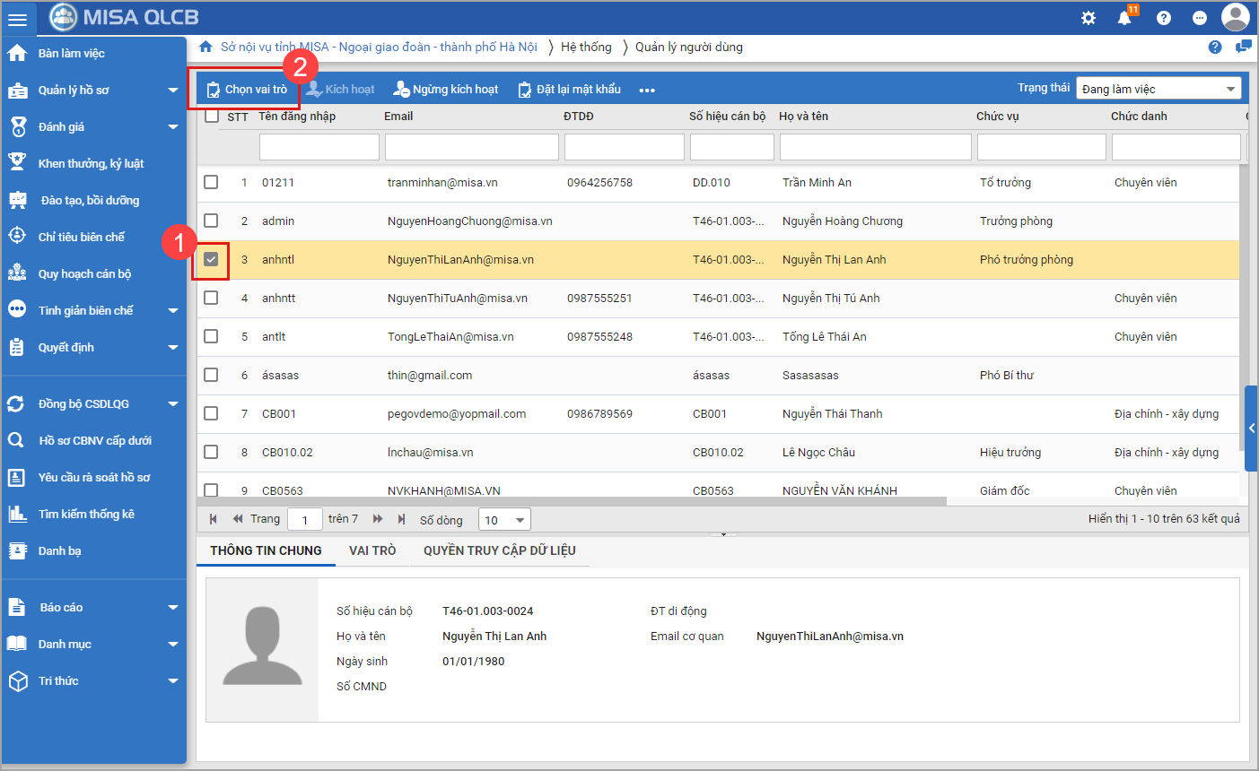 1. Vào menu Hệ thống\Quản lý người dùng.2. Để đảm bảo An toàn thông tin, anh/chị nhập mật khẩu (mật khẩu tài khoản) sau đó chọn Đồng ý3. Chọn CBCCVC trên danh sách, nhấn Chọn vai trò.4. Chọn vai trò cho CBCCVC. Nhấn Đồng ý.
