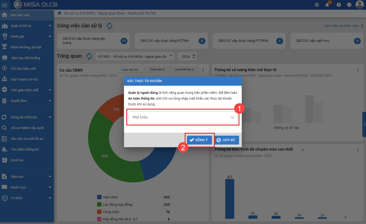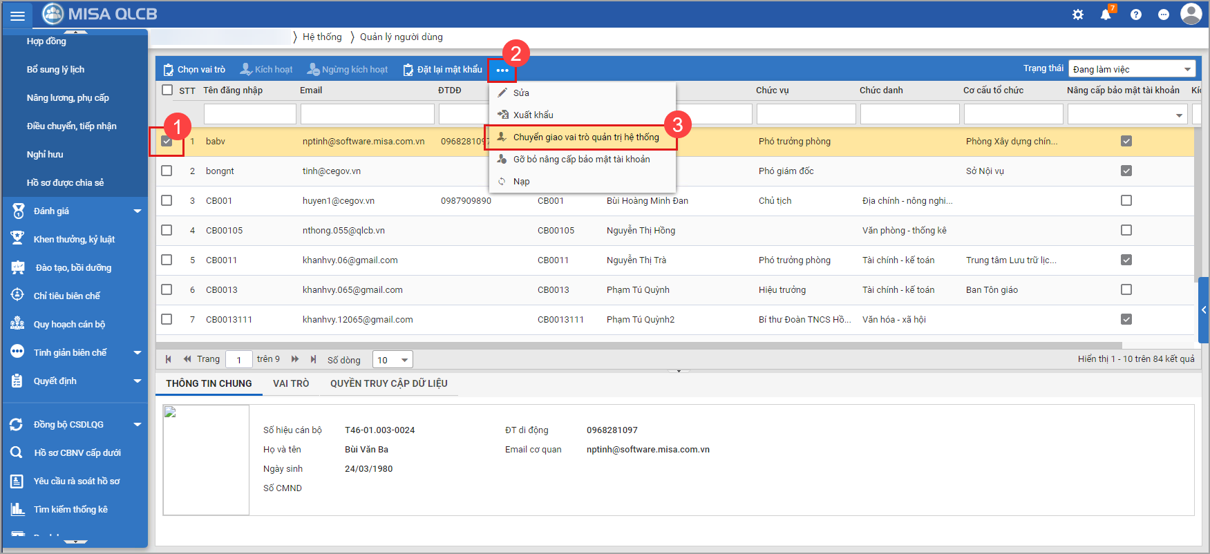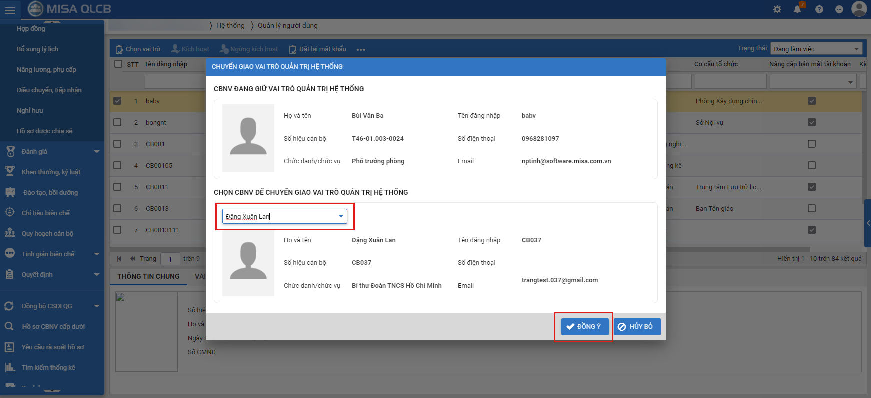 1. Vào menu Hệ thống\Quản lý người dùng.2. Để đảm bảo An toàn thông tin, anh/chị nhập mật khẩu (mật khẩu tài khoản) sau đó chọn Đồng ý3. Chọn CBCCVC là quản trị hệ thống, chọn biểu tượng dấu 3 chấm, sau đó chọn Chuyển giao vai trò quản trị hệ thống4. Chọn cán bộ chuyển giao quyền quản trị hệ thống, chọn Đồng ý để chuyển quyền quản trị hệ thống