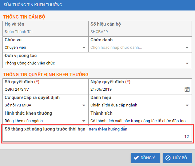• Để lập được danh sách nâng lương trước thời hạn do có thành tích xuất sắc thì khi khai báo bản ghi khen thưởng, anh/chị nhập Số tháng xét nâng lương trước thời hạn