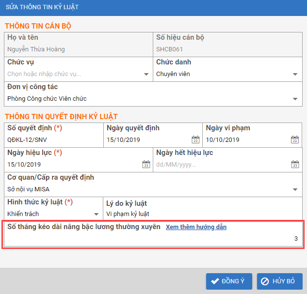 • Khi khai báo bản ghi kỷ luật và nhập Số tháng kéo dài nâng bậc lương thường xuyên để phần mềm có căn cứ xác định danh sách nâng bậc lương thường xuyên.
