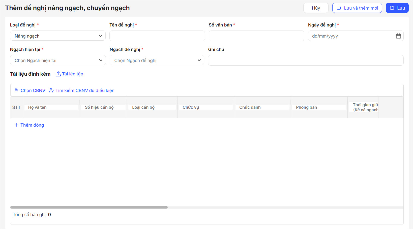 - Với từng nhân sự, điền/lựa chọn các thông tin: Họ tên, Số hiệu, Loại cán bộ, Chức vụ, Chức danh, Phòng ban, Thời gian giữ ngạch hiện tại.