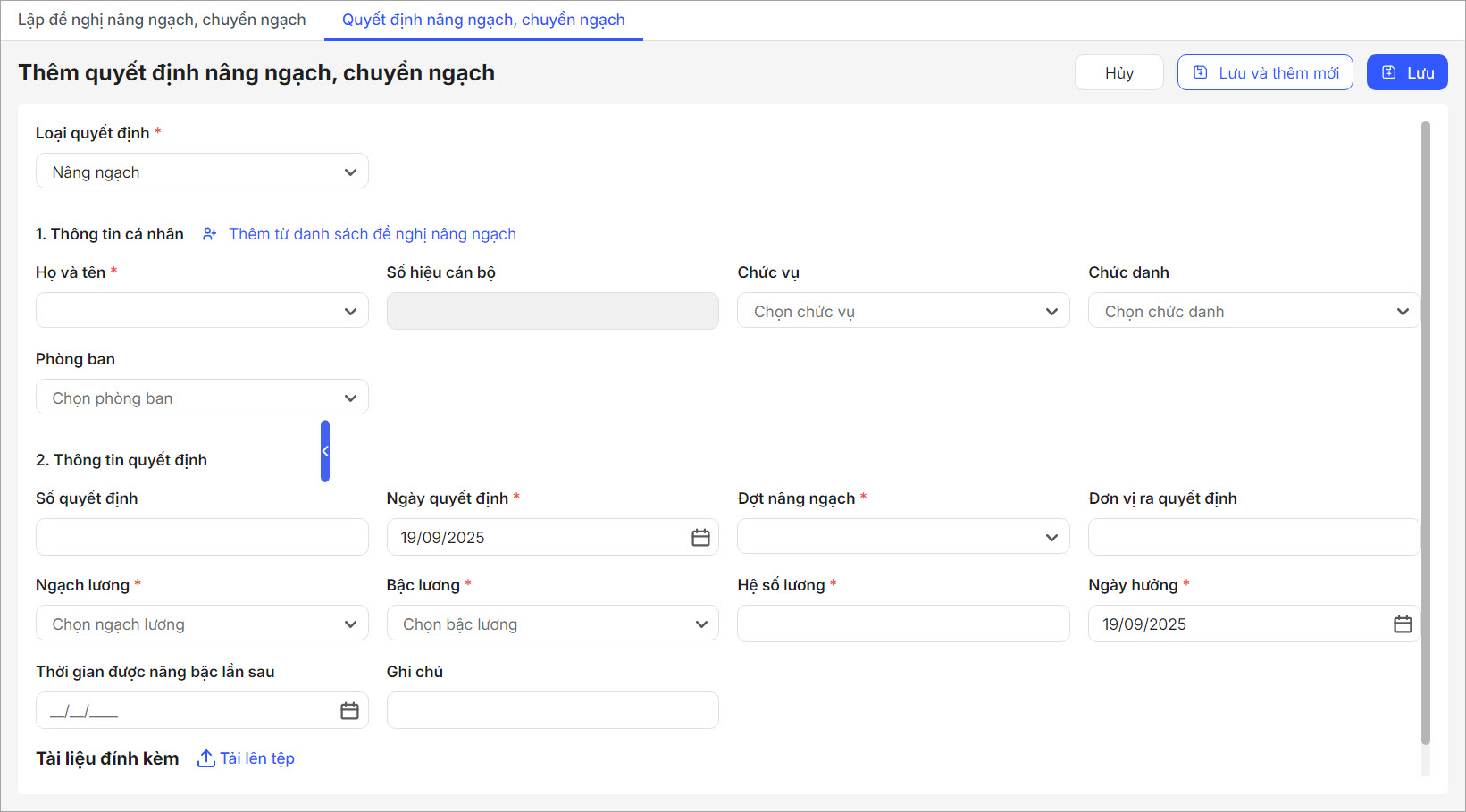 - Tải lên tệp: Nhấn để upload hồ sơ, quyết định, tài liệu liên quan đến việc nâng/chuyển ngạch.