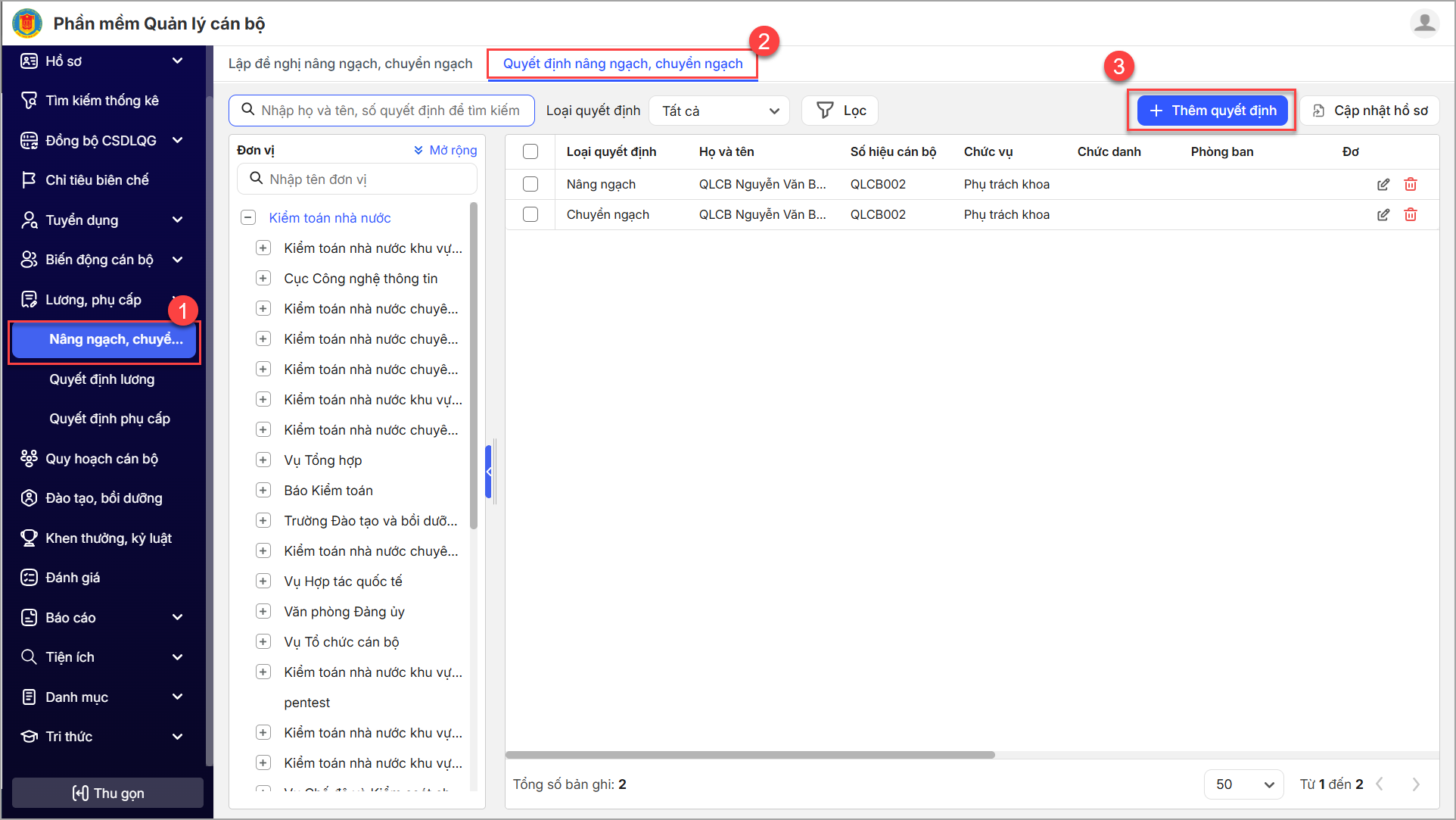 1. Anh/chị vào menu Nâng ngạch, chuyển ngạch\Quyết định nâng ngạch, chuyển ngạch\Thêm quyết định