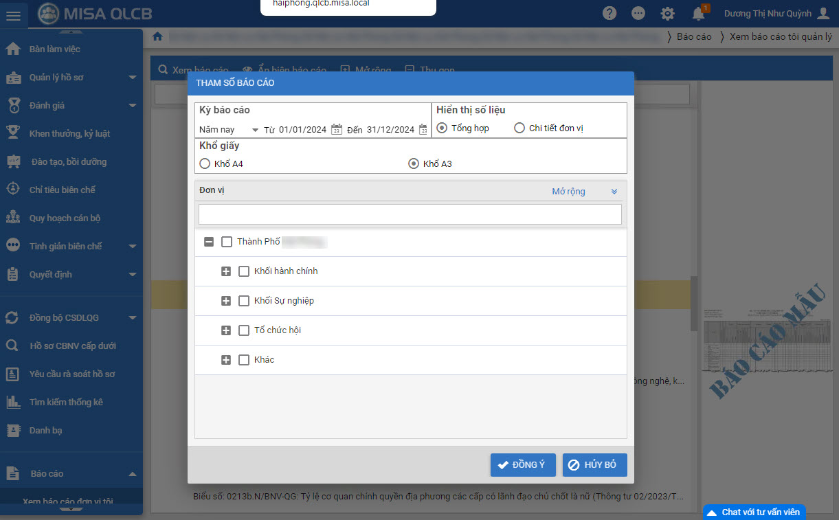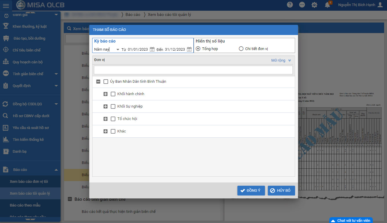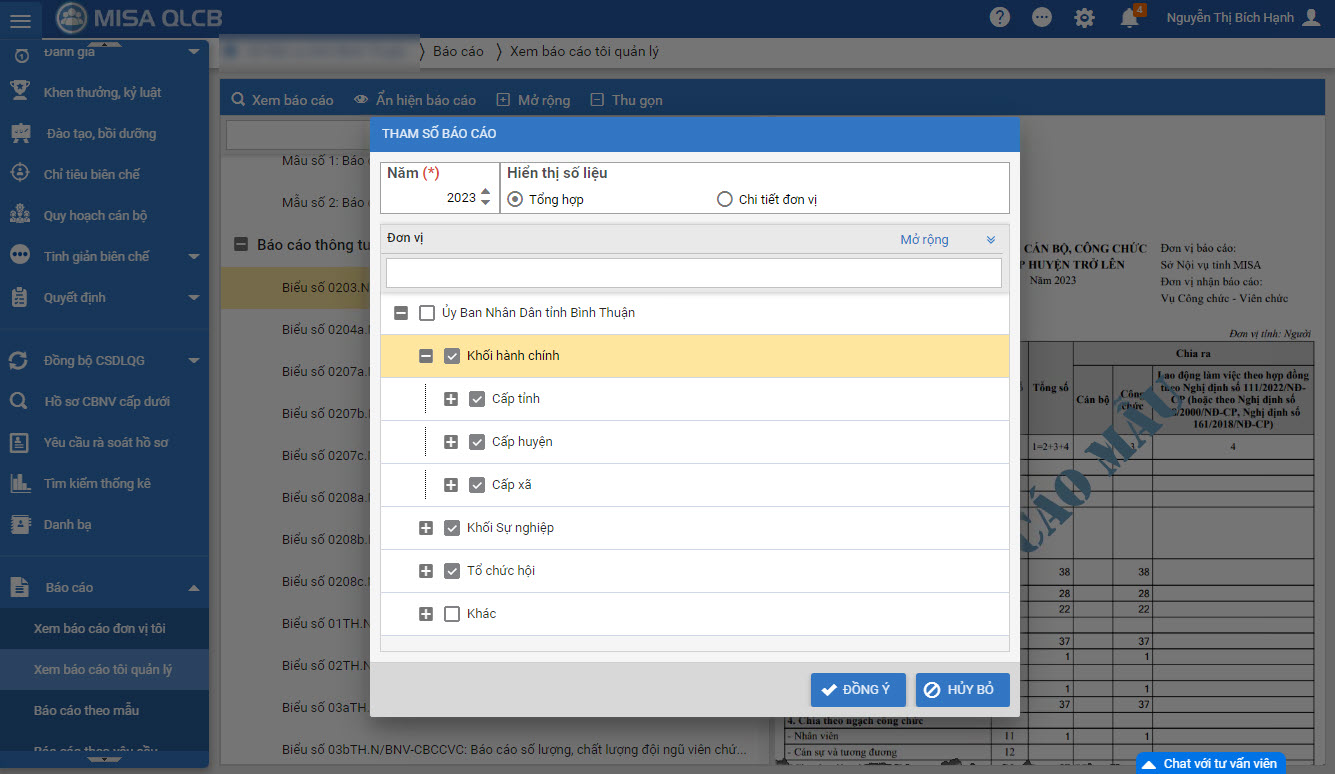 - Với các mẫu báo cáo còn lại: Chọn kỳ báo cáo (có thể tùy chỉnh thời gian để xem báo cáo), tích chọn hiển thị số liệu là Tổng hợp/Chi tiết đơn vị, chọn đơn vị cần xem báo cáo. Sau đó anh/chị chọn Đồng ý để xem báo cáo.