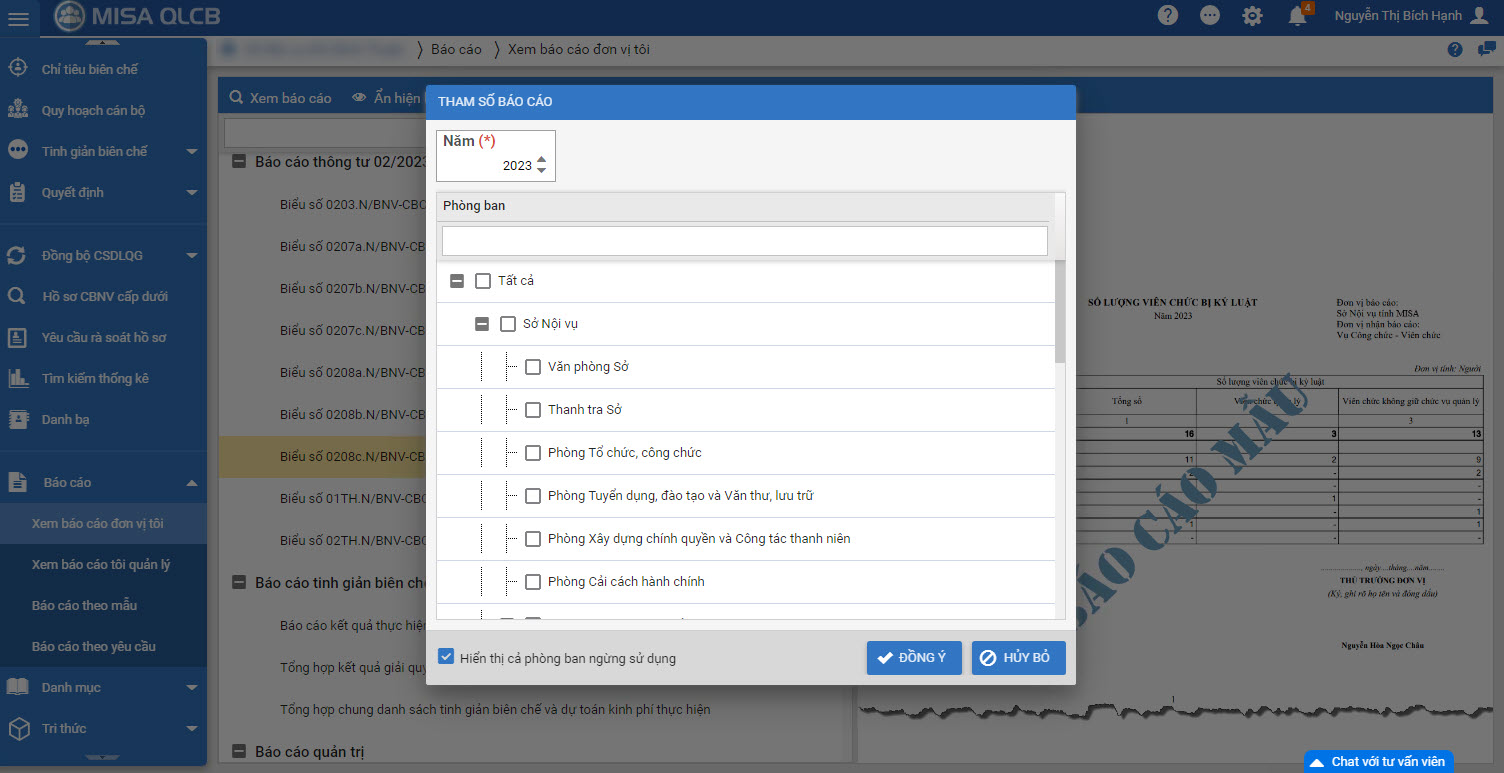 - Với các báo cáo: Biểu mẫu 0203.N/BNV-CBCCVC; Biểu mẫu 0208a.N/BNV-CBCCVC; Biểu mẫu 0208b.N/BNV-CBCCVC; Biểu mẫu 0208c.N/BNV-CBCCVC: Chọn Năm báo cáo, tích chọn Phòng ban. Tích chọn Hiển thị cả phòng ban ngưng sử dụng phần mềm sẽ lấy lên các phòng ban nhưng sử dụng. Sau đó chọn Đồng ý để xem báo cáo.