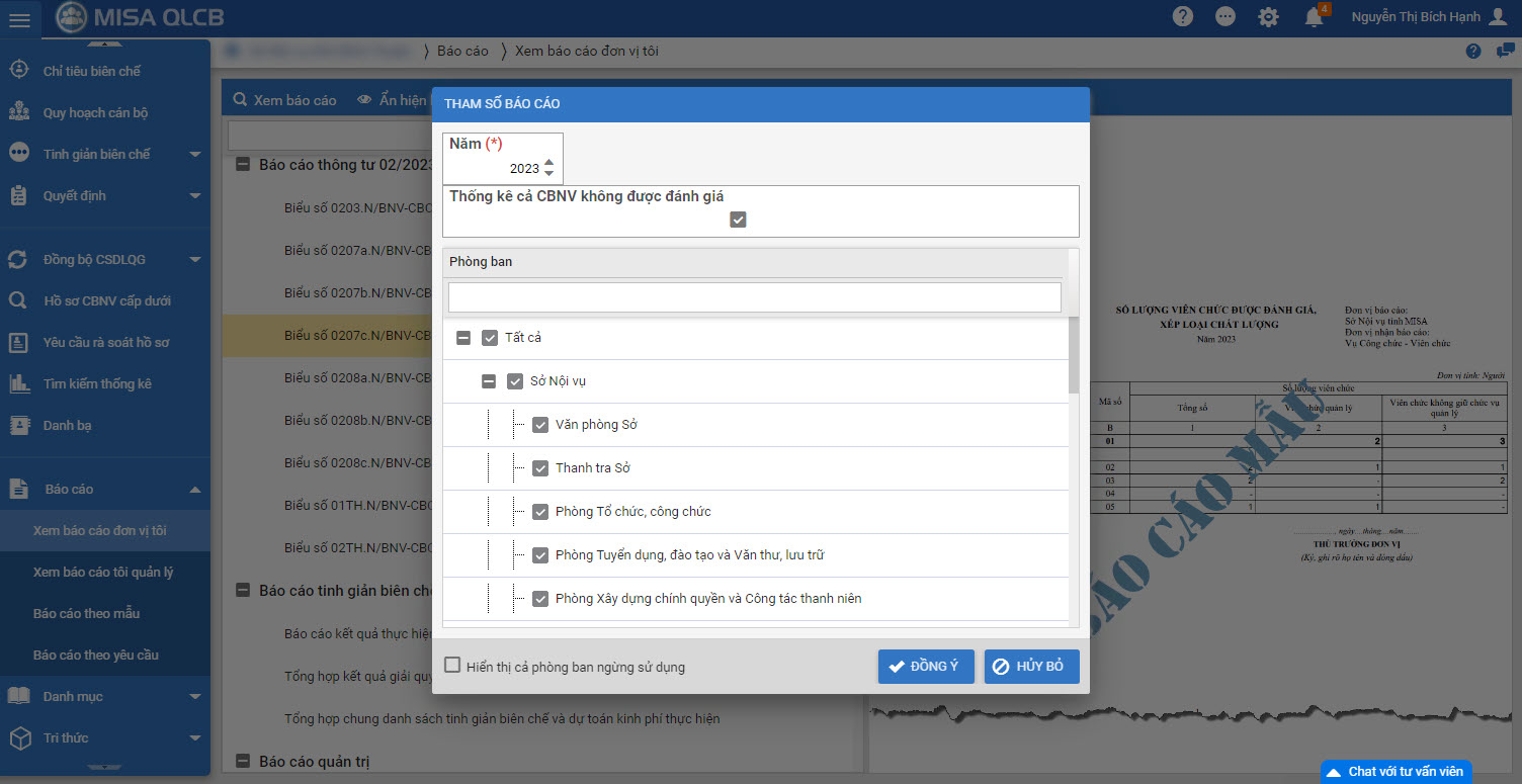 - Với các báo cáo: Biểu mẫu 0207a.N/BNV-CBCCVC; Biểu mẫu 0207b.N/BNV-CBCCVC; Biểu mẫu 0207c.N/BNV-CBCCVC; Chọn Năm báo cáo, tích chọn Thống kê cả CBNV không được đánh giá phần mềm sẽ lấy lên dữ liệu của các CBNV không được đánh giá, tích chọn Phòng ban. Tích chọn Hiển thị cả phòng ban ngưng sử dụng phần mềm sẽ lấy lên các phòng ban nhưng sử dụng. Sau đó chọn Đồng ý để xem báo cáo.