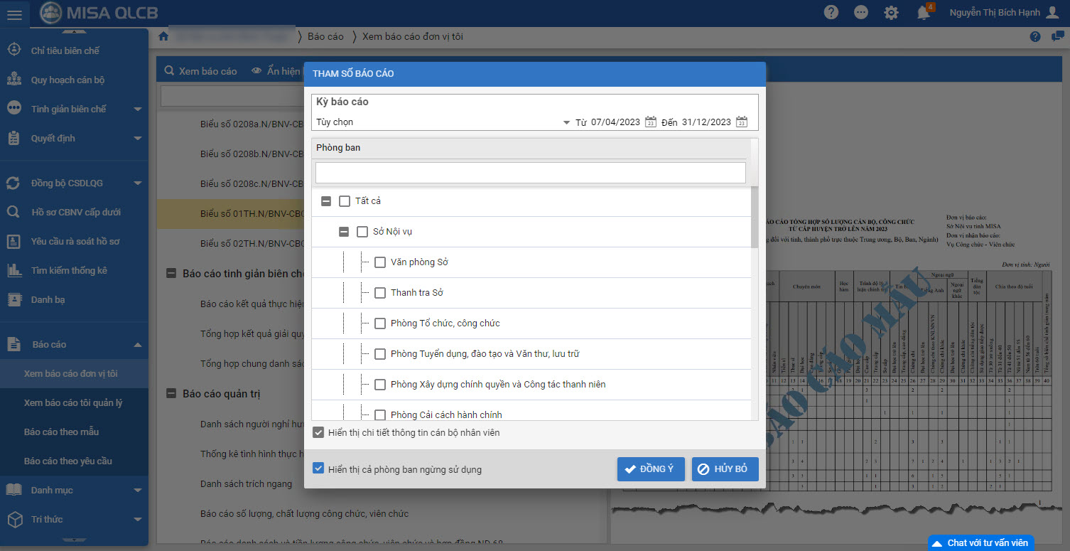 - Với các báo cáo còn lại: Chọn kỳ báo cáo (có thể tùy chỉnh khoảng thời gian để xem số liệu báo cáo), tích chọn Phòng ban, nếu muốn hiển thị chi tiết thông tin cán bộ nhân viên anh/chị tích chọn Hiển thị chi tiết thông tin cán bộ nhân viên. Tích chọn Hiển thị cả phòng ban ngưng sử dụng phần mềm sẽ hiển thị cả phòng ban ngừng sử dụng. Sau đó chọn Đồng ý để xem báo cáo.