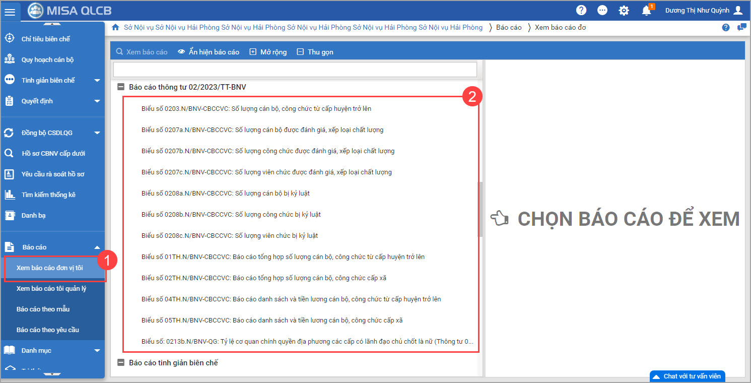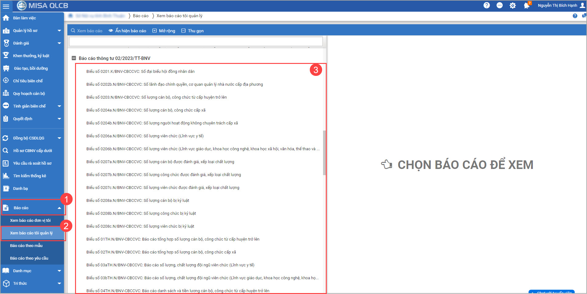 - Vào Menu Báo cáo\Xem báo cáo tôi quản lý, tại nhóm Báo cáo Thông tư 02/2023/TT-BNV: Nhấn đúp chuột tại báo cáo cần in.
