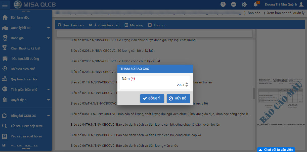 - Với mẫu báo cáo: Biểu mẫu 0213b.N/BNV-QG: Tỷ lệ cơ quan chính quyền địa phương có lãnh đạo chủ chốt là nữ. Chọn năm để xem báo cáo, sau đó chọn Đồng ý.