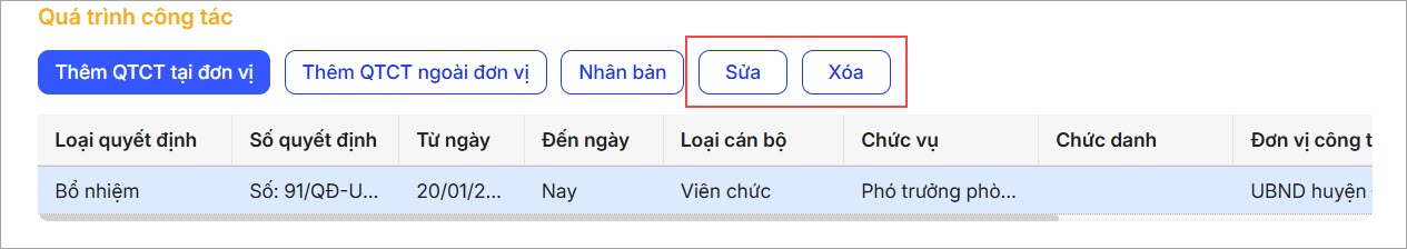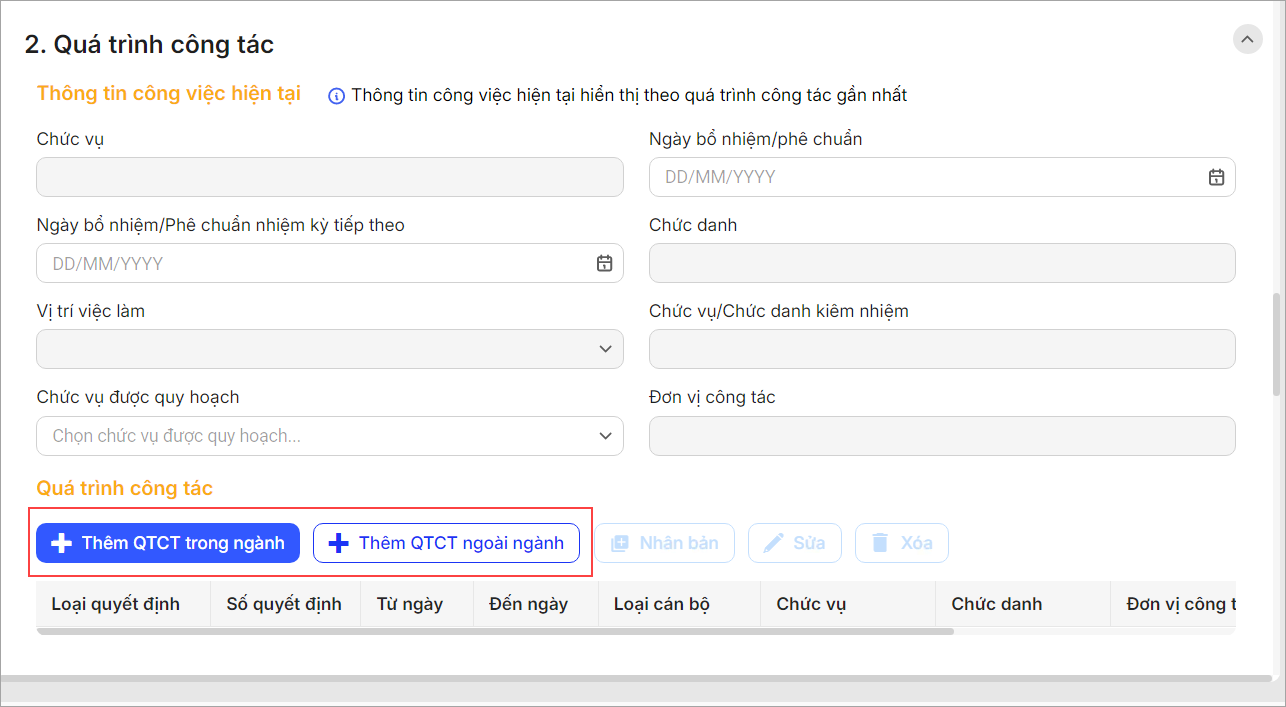 Ví dụ: Ngày 25/05/2017. (Thông tin này thường được ghi ngay bên dưới số quyết định hoặc cuối văn bản.) - Nghề nghiệp trước khi tuyển dụng: Nghề nghiệp, công việc làm trước khi được tuyển dụng. Nhập theo thông tin của CBNV, ví dụ: