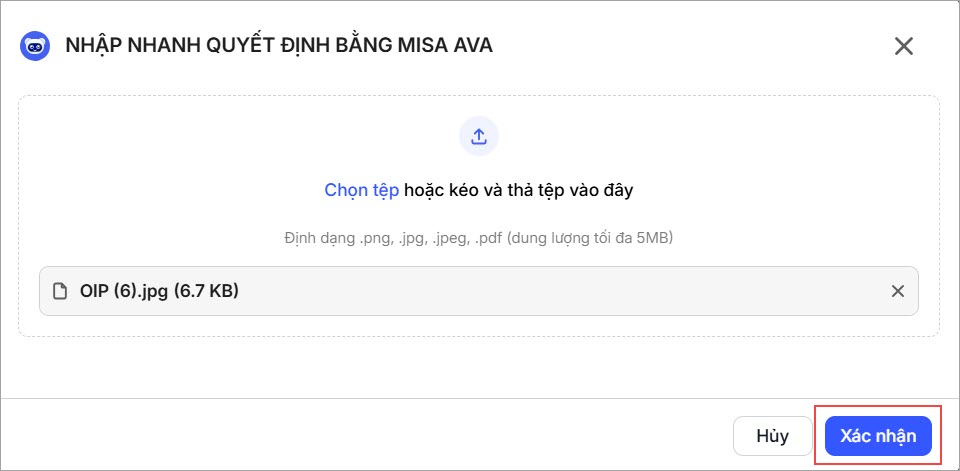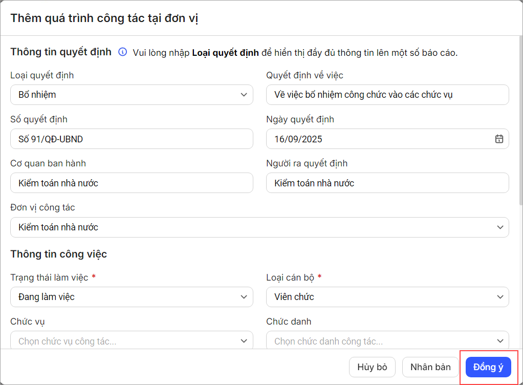 Ví dụ: Số 123/QĐ-UBND. (Thông tin này thường nằm ở phần đầu của quyết định tuyển dụng.) - Ngày quyết định: Nhập ngày ký của quyết định tuyển dụng.
