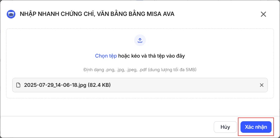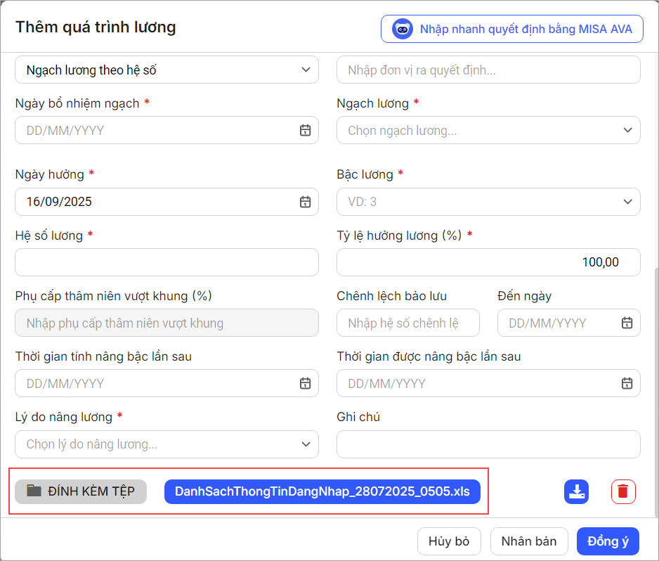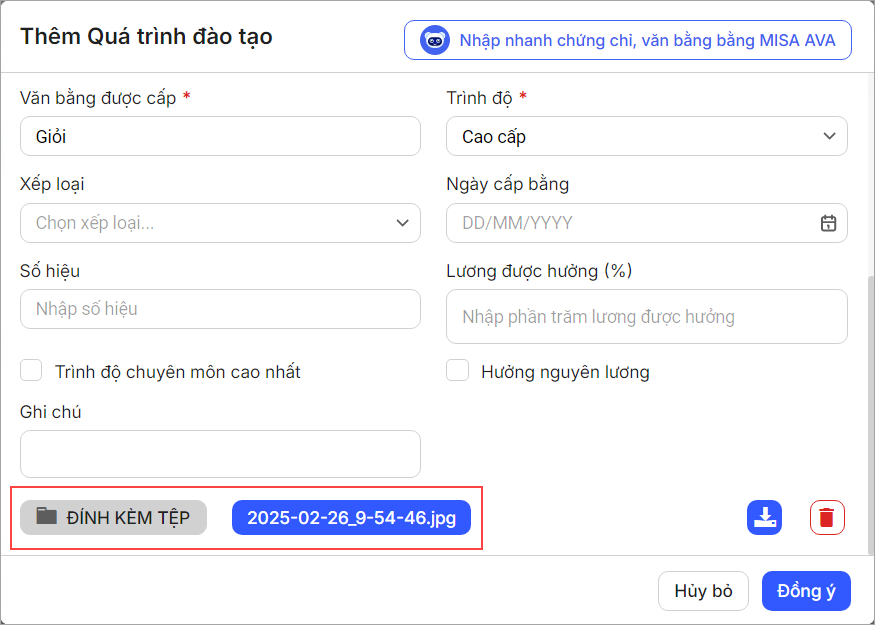 - Khi đính kèm file tại mục 12 hoặc tại các chức năng đính kèm tệp trên các bản ghi chi tiết (quá trình công tác, lương, phụ cấp…), phần mềm cho phép đính kèm tệp <= 5MB.