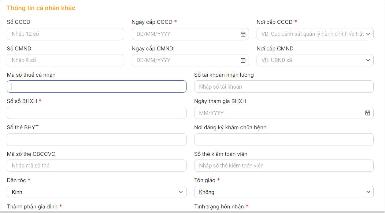 - Nơi cấp: Nhập nơi cấp trên CCCD của CBNV.