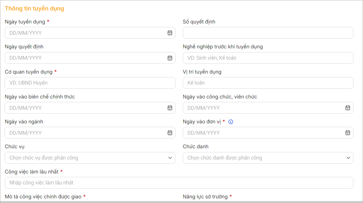 - Ngày tuyển dụng: Nhập ngày chính thức được tuyển dụng trên quyết định tuyển dụng vào ngành (VD: lấy tại “kể từ ngày 01/06/2017”).