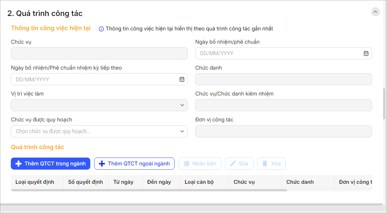 Hiển thị theo thông tin khai báo tại quá trình công tác gần nhất.