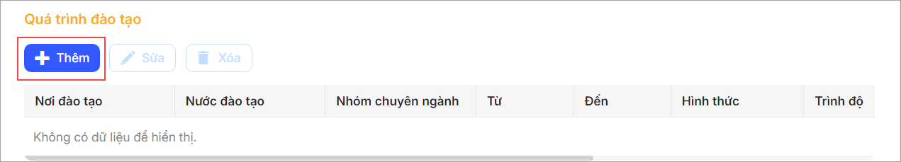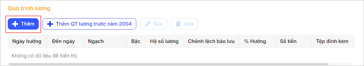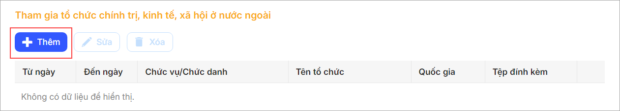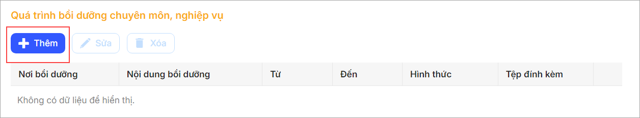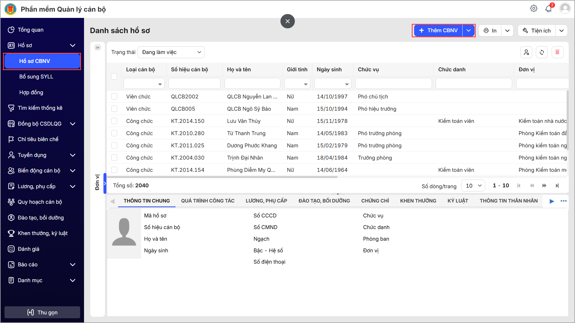 - Nhấn Thêm để mở màn hình nhập liệu chi tiết các thông tin hồ sơ CBNV.