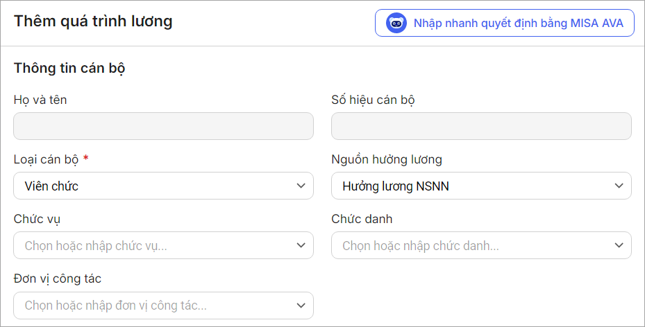 - Số hiệu CBCCVC (Đơn vị sử dụng) (*): Nhập số hiệu CBCCVC (Đơn vị sử dụng)