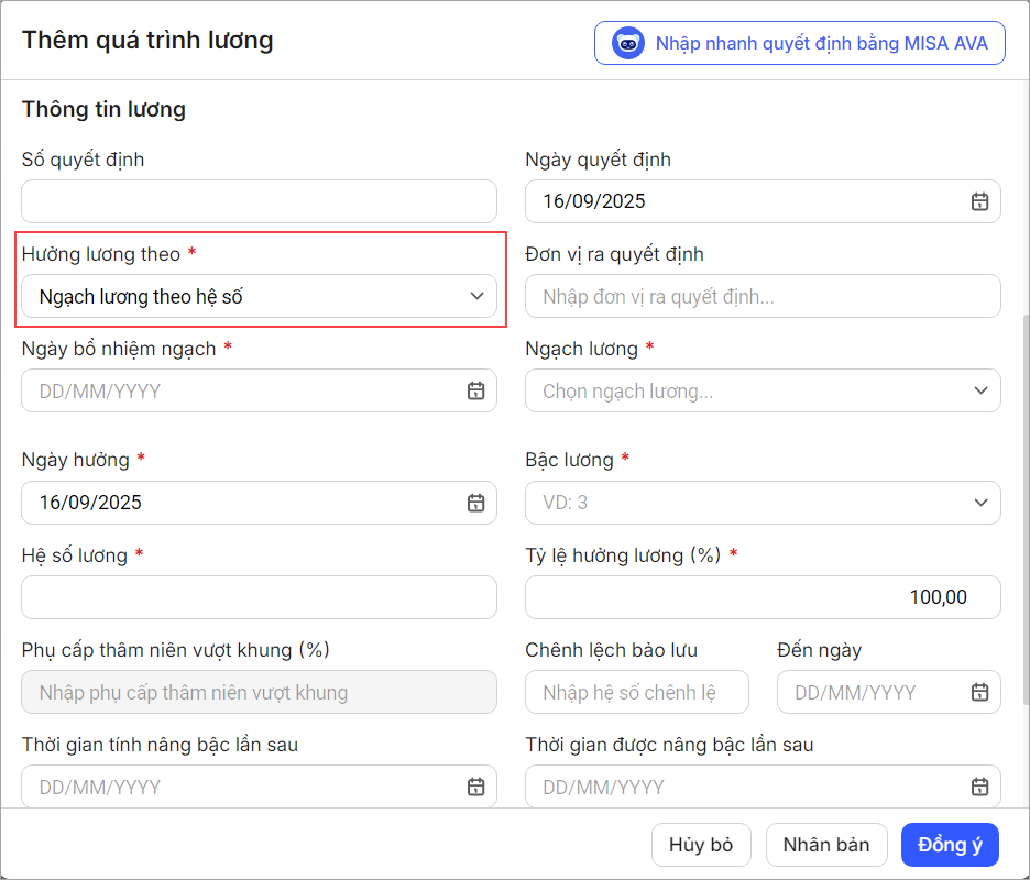 Ví dụ các trường hợp sau:- Nhập theo quyết định tuyển dụng: Đối với CBNV được tuyển dụng chính thức là viên chức không qua thời gian tập sự.