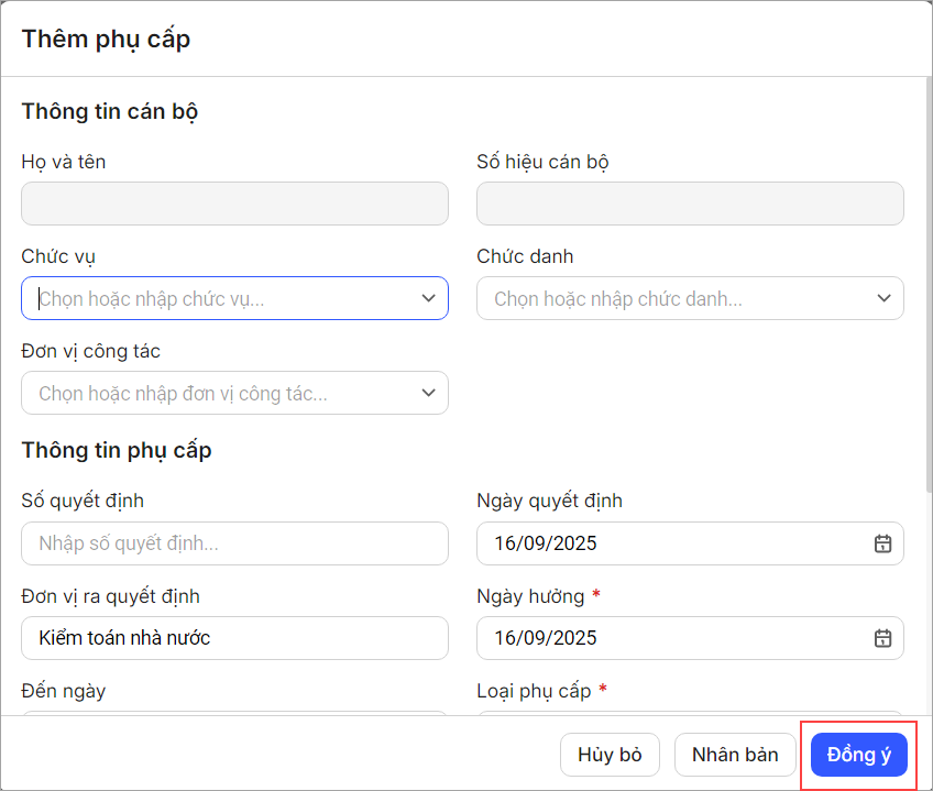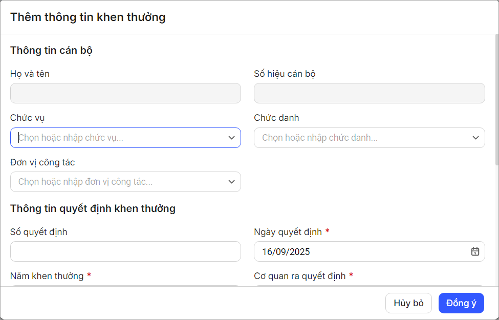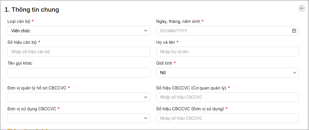 - Số hiệu CBCCVC (Cơ quan quản lý) (*): Nhập số hiệu CBCCVC (Cơ quan quản lý)
