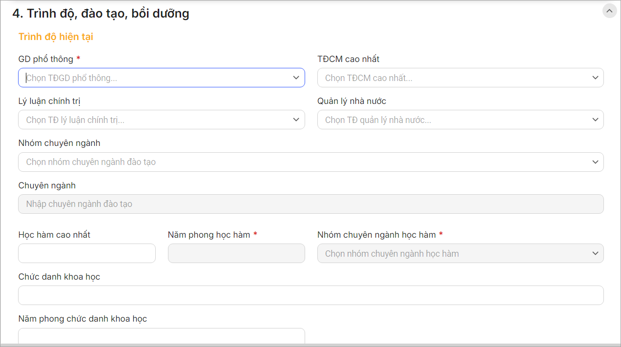- Loại cán bộ (*): Phần mềm tự động lấy lên thông tin này theo khai báo của CBTC đơn vị, anh/chị không cần khai báo thông tin này.