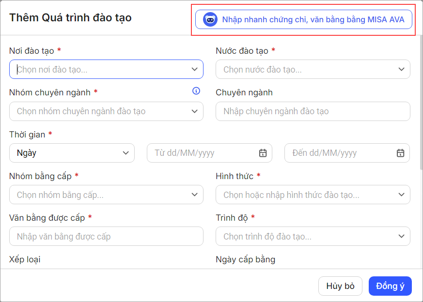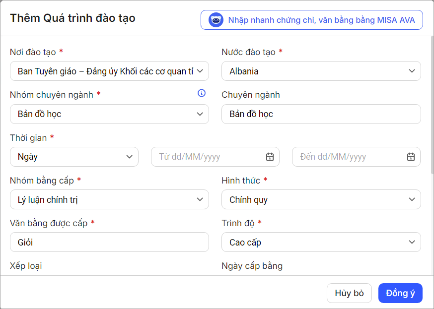 - Anh/chị cần nhập đầy đủ các thông tin có dấu (*) bắt buộc. Các trường thông tin còn lại nếu có dữ liệu, CBTC vui lòng bổ sung đầy đủ.
