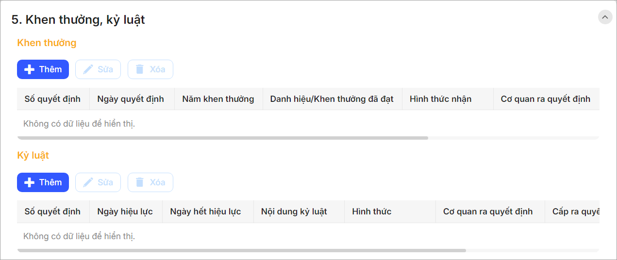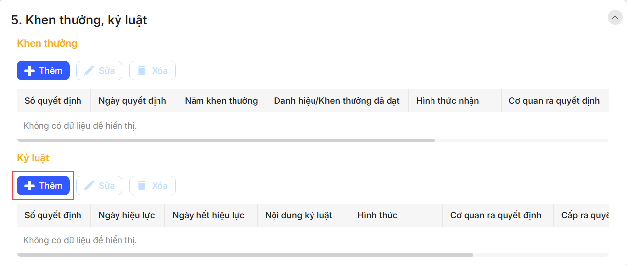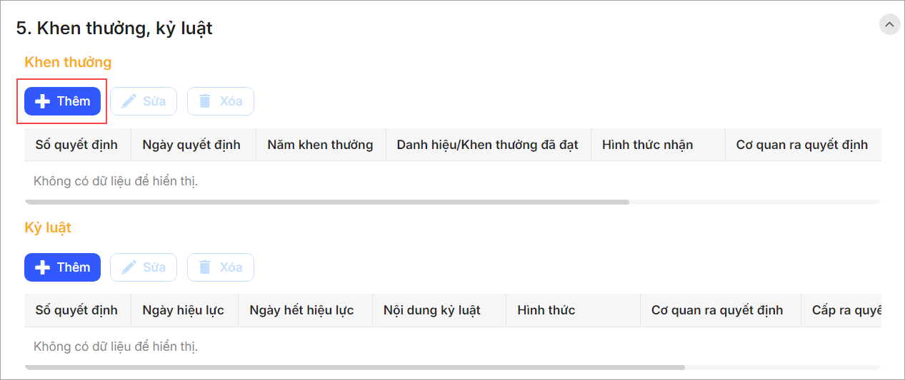 - Nhấn Thêm để lưu trữ các tài liệu về quyết định, văn bản, các tài liệu liên quan đến hồ sơ CBNV: