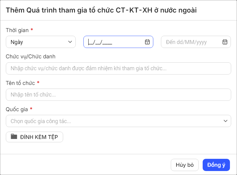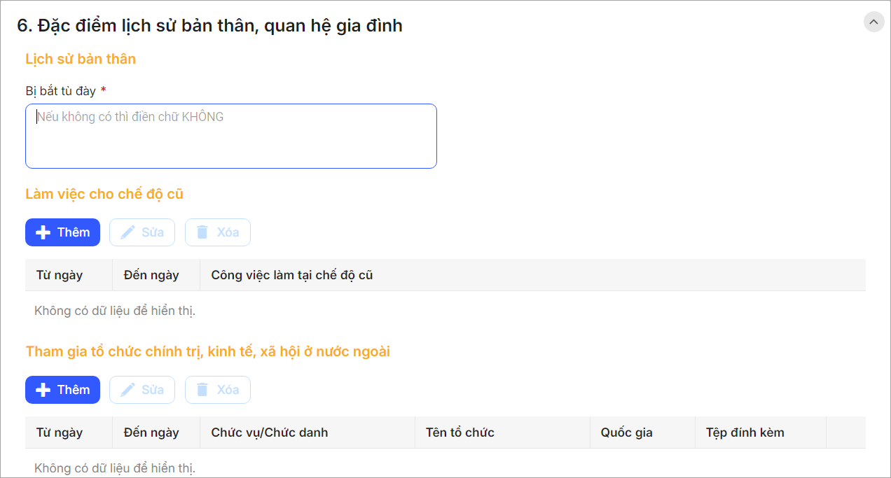 - Ngày tham gia TCCTXH đầu tiên: Nhập ngày tháng năm tham gia tổ chức chính trị – xã hội đầu tiên.