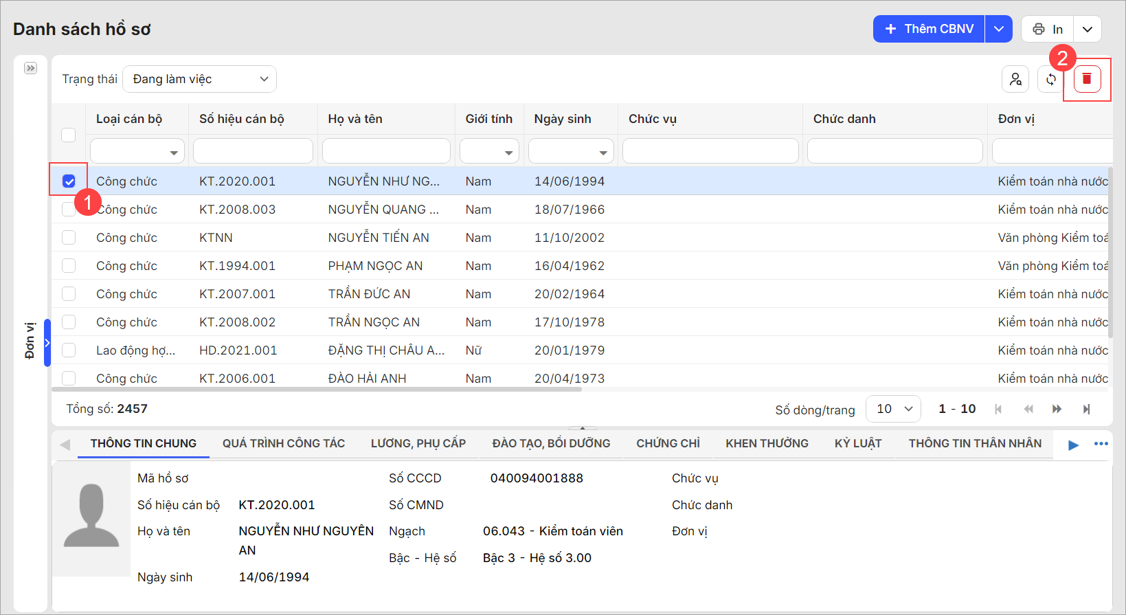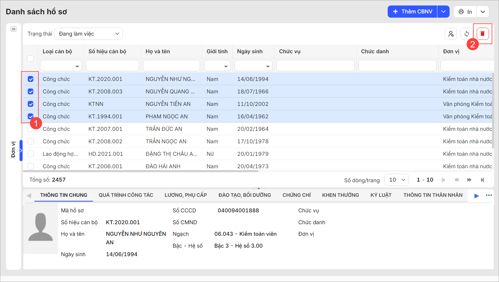 Để xóa từng hồ sơ CBNV, tích chọn CBNV, sau đó chọn Biểu tượng thùng rác.